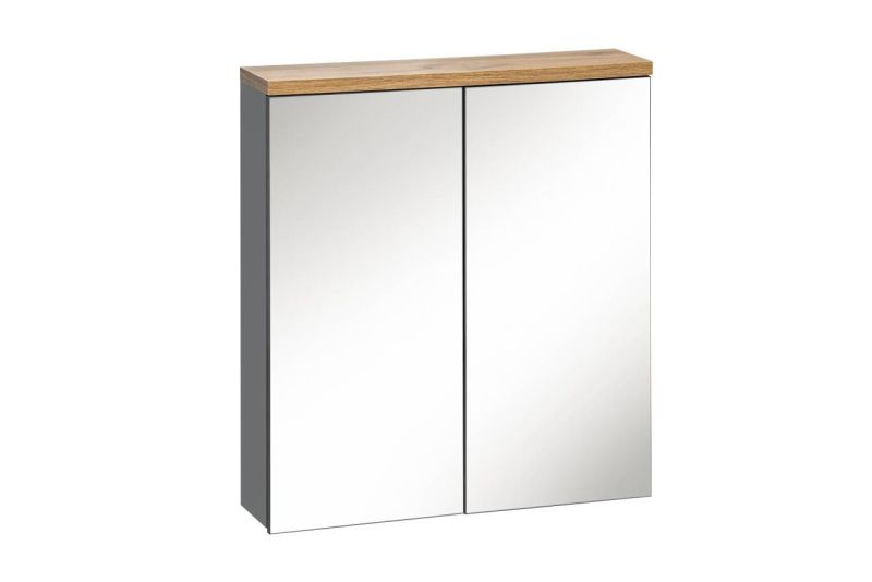 Závesná kúpeľňová skrinka so zrkadlom a dvoma dvierkami, ktoré odhaľujú vnútorný úložný priestor vybavený dvoma policami. Skrinka v elegantnej kombinácii sivého vysokého lesku a dubových prvkov prináša moderný a nadčasový dizajn.