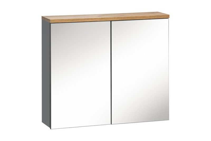 Závesná kúpeľňová skrinka so zrkadlom a dvoma dvierkami. Vo vnútri sa nachádzajú dve police na uskladnenie. Skrinka v elegantnej kombinácii sivého vysokého lesku a dubových prvkov je ideálnym riešením pre moderný dizajn.