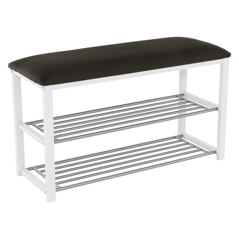Lavica s botníkom v kombinácii bieleho kovu a sivej látky poskytuje pohodlné sedenie a úložný priestor na obuv
