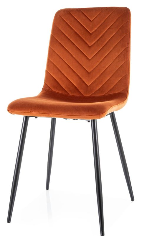 Luxusná jedálenská stolička s výrazným prešívaním v tvare „V“ v cynamon zamatovej látke vnáša do interiéru eleganciu a pohodlie. Čierne kovové nohy dopĺňajú moderný dizajn a zaručujú stabilitu