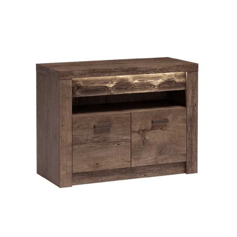 Štýlová luxusná komoda v tmavom jaseňovom dekore ponúka robustný vzhľad a detailnú reliéfnu kresbu. Kombinuje uzatvorený aj otvorený úložný priestor, čím je ideálna na dekorácie aj praktické uskladnenie