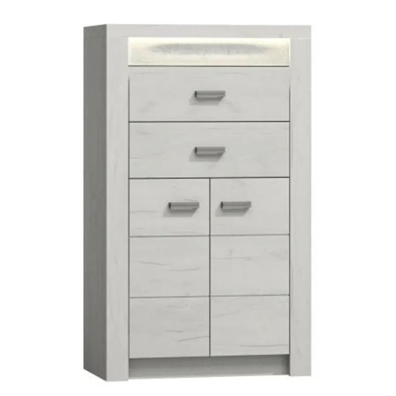 Luxusná komoda v prevedení jaseň biely vyniká masívnym dizajnom s prvkami surového maľovaného dreva a výraznou reliéfnou kresbou. Je vhodná do obývacích izieb a jedální, kde dodá štýl a dostatok úložného priestoru. Komoda obsahuje dve zásuvky a dvojdverovú skrinku s poličkou, ktoré umožňujú praktické usporiadanie vecí