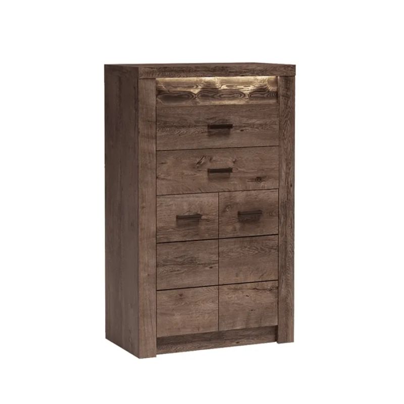 Masívna komoda s prvkami surového dreva v tmavom jaseňovom dekore vyniká výraznou reliéfnou kresbou. Kombinuje dvojdverovú skrinku s poličkou a dva priestranné šuplíky. Skvelá voľba pre obývačky a jedálne