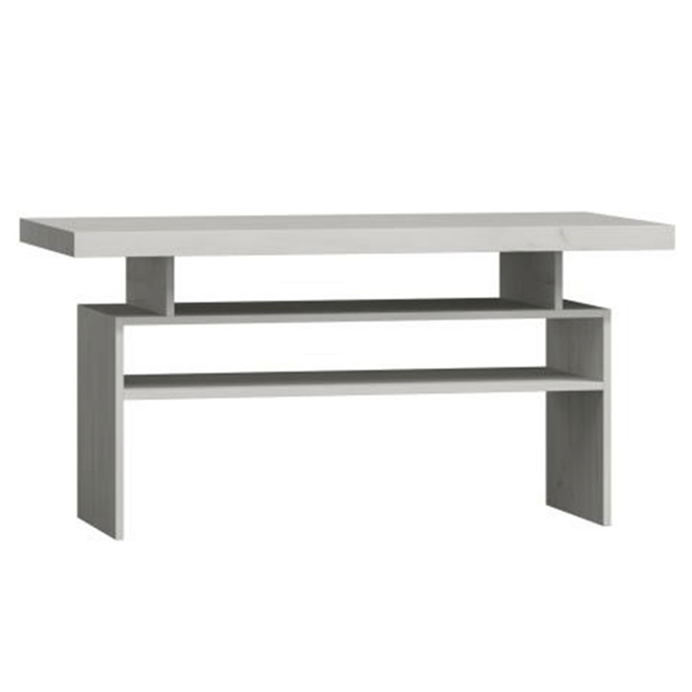 Konferenčný stolík v masívnom dizajne s výraznou reliéfovou kresbou, ideálny pre zariadenie obývacích izieb a jedálni. Disponuje praktickým odkladacím priestorom v podobe dvoch políc