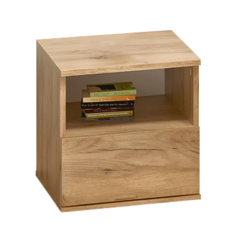 Nočný stolík vyrobený na Slovensku z kvalitnej laminovanej DTD v príjemnom prevedení dub craft zlatý. Malý a elegantný doplnok do spálne či detskej izby, ktorý poskytuje praktický úložný priestor v podobe šuplíka a otvorenej odkladacej plochy. Minimalistický dizajn s čistými líniami ľahko zapadne do každého interiéru