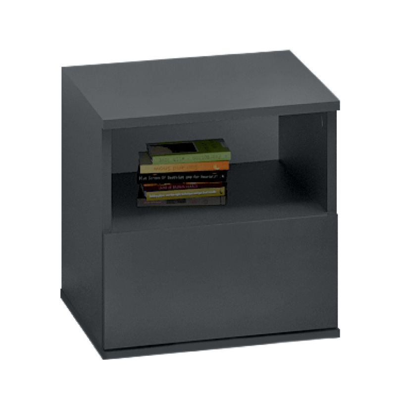Nočný stolík vyrobený na Slovensku z kvalitnej laminovanej DTD v grafitovom prevedení. Malý a elegantný doplnok do spálne alebo detskej izby, ktorý poskytuje praktický úložný priestor v podobe šuplíka a otvorenej odkladacej plochy. Minimalistický dizajn s čistými líniami sa jednoducho prispôsobí každému interiéru