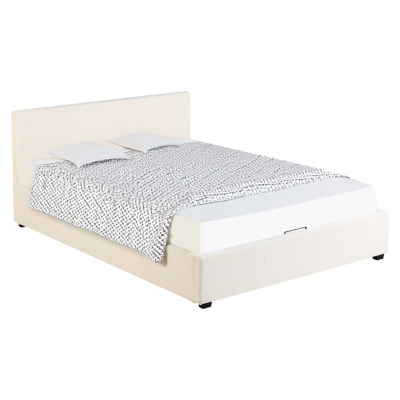 Posteľ v jemnej Bouclé látke spája nadčasový dizajn, praktické riešenie úložného priestoru a výnimočný komfort – ideálna voľba pre modernú spálňu s dôrazom na eleganciu a funkčnosť.