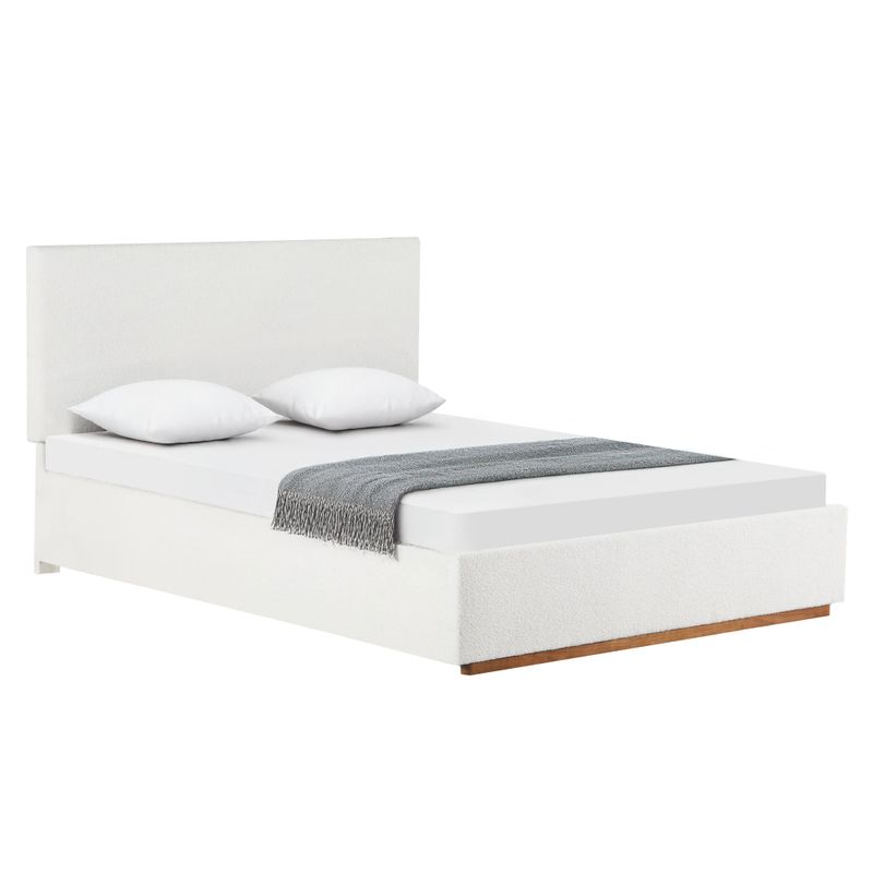 Elegantná manželská posteľ, ktorá zaujme svojím jemným a sofistikovaným vzhľadom. Čalúnenie z trendovej Bouclé látky v čistej bielej farbe pôsobí mäkko a príjemne na dotyk, čím vnáša do spálne pocit vzdušnosti a pokoja. Praktická konštrukcia z MDF, preglejky a kovových častí skrýva výklopný lamelový rošt s úložným priestorom, ideálny na odkladanie vecí, ktoré chcete mať vždy poruke. Posteľ je dodávaná bez matraca. Odporúčame matrac s rozmerom 180x200 cm.