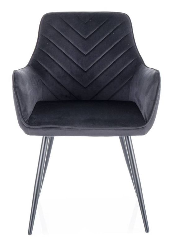 Moderná stolička s nadčasovým dizajnom a podrúčkami kombinuje komfort a eleganciu, ideálna do každého moderného interiéru. Sedák a operadlo sú čalúnené odolnou velvet látkou v čiernej farbe, ktorá je príjemná na dotyk a odolná voči každodennému používaniu. Prešívanie na operadle pridáva stoličke sofistikovaný vzhľad