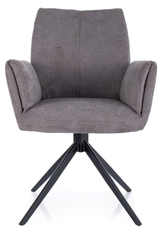 Moderná stolička s podrúčkami v kombinácii čiernej konštrukcie a sivej látky ponúka pohodlné posedenie a nadčasový dizajn. Sedák s podrúčkami je spojený s chrbtovou opierkou a obe časti sú čalúnené odolnou tkaninou, ktorá poskytuje dlhodobý komfort. Symetrické prešívanie na operadle dodáva stoličke elegantný vzhľad