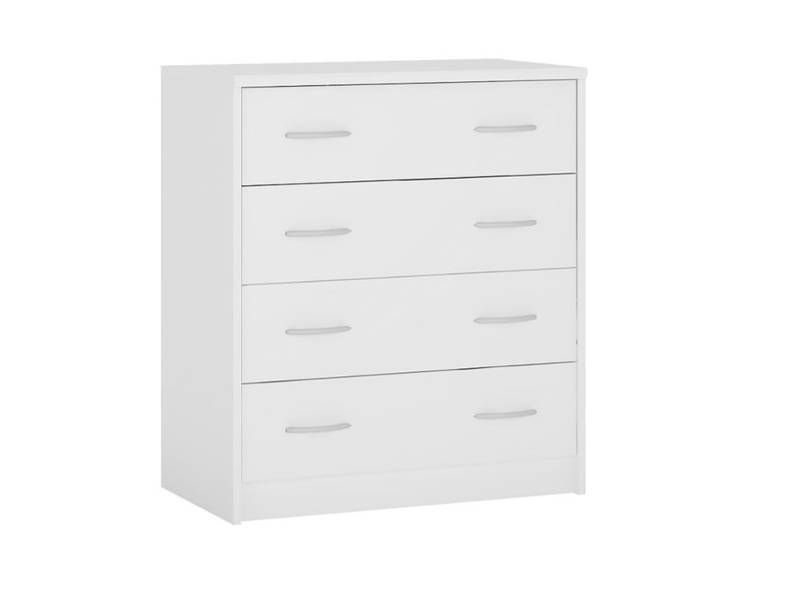 Moderná viacúčelová komoda s jednoduchým a štýlovým dizajnom. Táto biela komoda, vybavená štyrmi zásuvkami a striebornými plastovými úchytkami, je ideálnym riešením pre efektívnu organizáciu a úložný priestor.