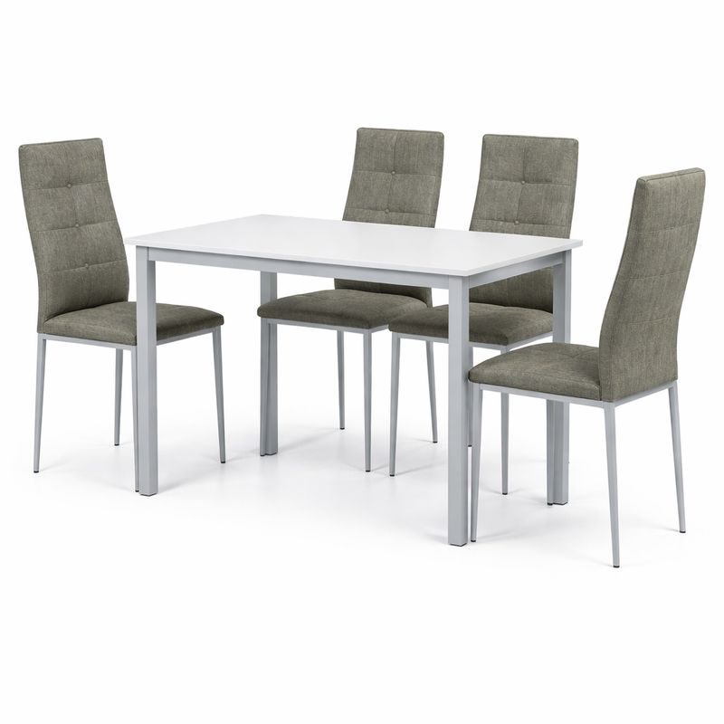 Jedálenský stôl s doskou z MDF v bielej farbe pôsobí prirodzene a nadčasovo. Matná povrchová úprava je odolná voči bežnému opotrebovaniu a zároveň nenáročná na údržbu. Stabilná kovová podnož v sivom prevedení dodáva stolu pevnosť a moderný industriálny charakter. Vďaka kompaktným rozmerom je vhodný aj do menších priestorov.