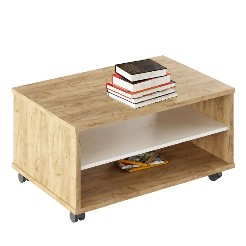 Tento moderný konferenčný stolík v kombinácii dub artisan a biela prináša do vášho interiéru nielen štýl, ale aj praktickosť. Vyrobený na Slovensku z kvalitnej DTD laminovanej dosky, stolík je vybavený štyrmi kolieskami, vďaka ktorým ho môžete jednoducho premiestniť podľa potreby. Otvorený úložný priestor je rozdelený policou na dve odkladacie plochy