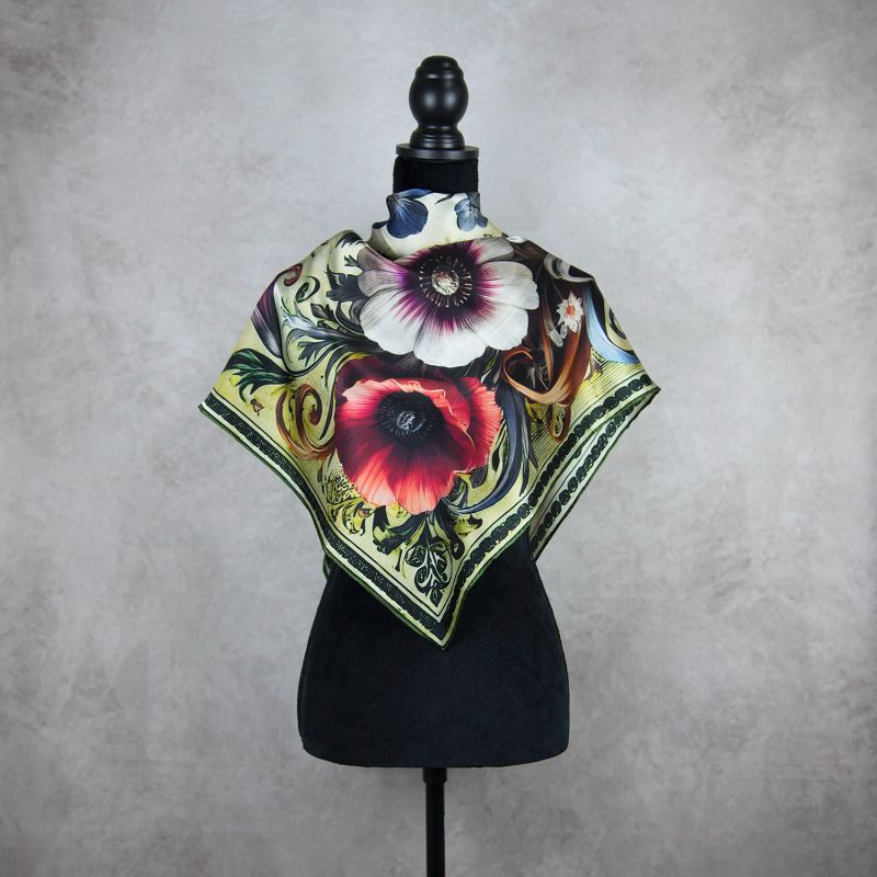 Luxusná hodvábna šatka vyrobená ručne na Slovensku zo 100 % prírodného hodvábu typu crepe satén s digitálnou potlačou originálneho motívu lúčnych kvetov. Táto šatka je stelesnením elegancie, kvality a prírodnej krásy