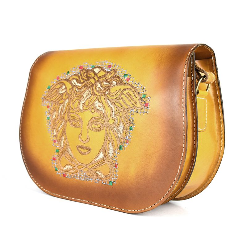 Módna kožená kabelka s výšivkou MEDUSA, ručne tieňovaná v tmavo žltej farbe