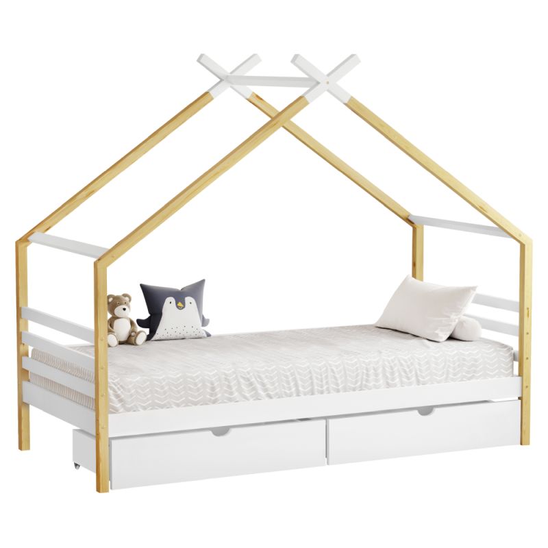 Posteľ je vyrobená z kvalitného borovicového dreva, ktoré zabezpečuje pevnosť a dlhú životnosť. Kombinácia bielej a prírodnej hnedej farby pôsobí nadčasovo a ľahko sa kombinuje s ostatným zariadením izby. Praktické výsuvné šuplíky ponúkajú dostatok priestoru na uloženie lôžkovín, hračiek či sezónnych vecí. Vytvorte pre svoje dieťa miesto, kde sa spája oddych, hra aj rozvoj fantázie.