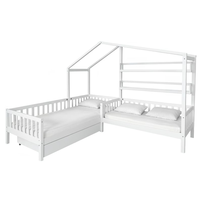 Štýlová Montessori posteľ pre 2 deti v tvare domčeka predstavuje dokonalé spojenie bezpečnosti, funkčnosti a hravého dizajnu. Originálne prevedenie v tvare domčeka a písmena L premení detskú izbu na čarovné miesto na spánok, hry aj oddych.