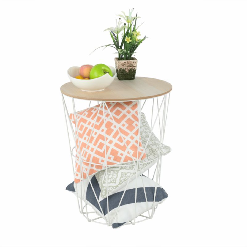 Netradičný príručný stolík s jedinečným dizajnom, ktorý spája bielu kovovú konštrukciu s vrchnou doskou z MDF v prírodnom odtieni. Vrchná doska je snímateľná, čo umožňuje praktické využitie úložného priestoru