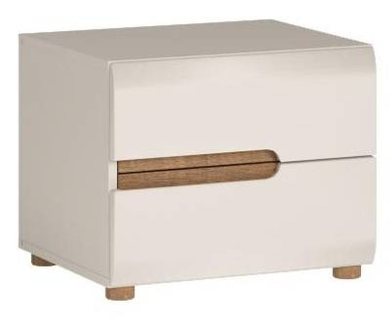Luxusný nočný stolík je ideálnou voľbou pre moderné interiéry, kde sa kladie dôraz na štýl a funkčnosť. Jeho elegantné prevedenie kombinuje vysoký lesk na predných plochách s matnou bielou farbou korpusov, čo vytvára sofistikovaný vzhľad. Vkusné hnedé lišty vo farbe dub truflový pridávajú stolíku na atraktívnosti a zvyšujú jeho estetickú hodnotu.