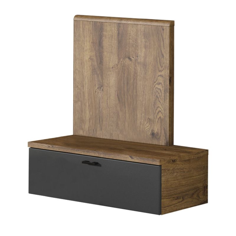 Moderný nočný stolík v kombinácii farieb dub ribeck a tmavý grafit je vyrobený z kvalitnej laminovanej drevotriesky. Disponuje jedným šuplíkom a je v pravom prevedení, ktoré umožní jednoduché umiestnenie k posteli