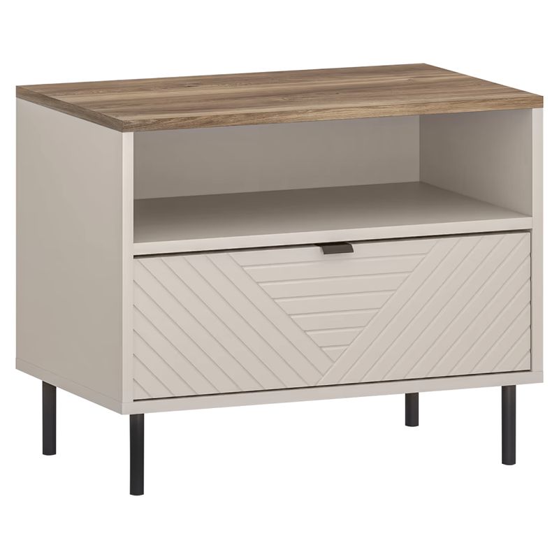 Farebná kombinácia kašmír a dub castello pôsobí jemne a moderne, zatiaľ čo čierne kovové nožičky a úchytky dodávajú stolíku elegantný kontrast. Stolík ponúka úložný priestor v podobe jedného šuplíka a otvoreného priestoru s policou, čo zaručuje praktické využitie.
