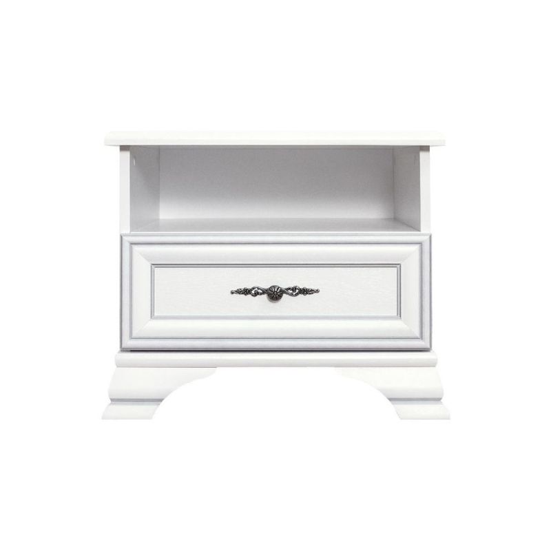 Nočný stolík v jemnej alpskej bielej farbe prináša do vášho interiéru nadčasový a čistý vzhľad. Vyrobený z laminovanej DTD, disponuje jedným šuplíkom a otvoreným úložným priestorom. Štýlové kovové úchytky v prevedení antické striebro zaručujú jednoduchú manipuláciu