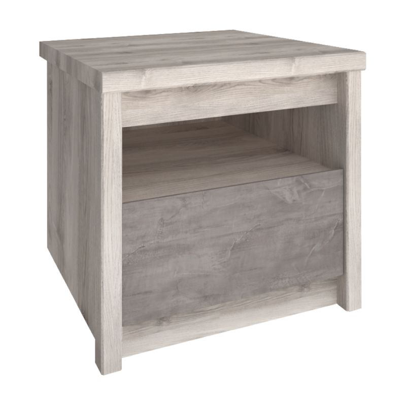 Nočný stolík v modernom dizajne s farebnou kombináciou gaštan nairobi a onyx je vyrobený z laminovanej drevotriesky (DTD). Ponúka praktický úložný priestor v podobe jednej zásuvky a otvorenej odkladacej plochy