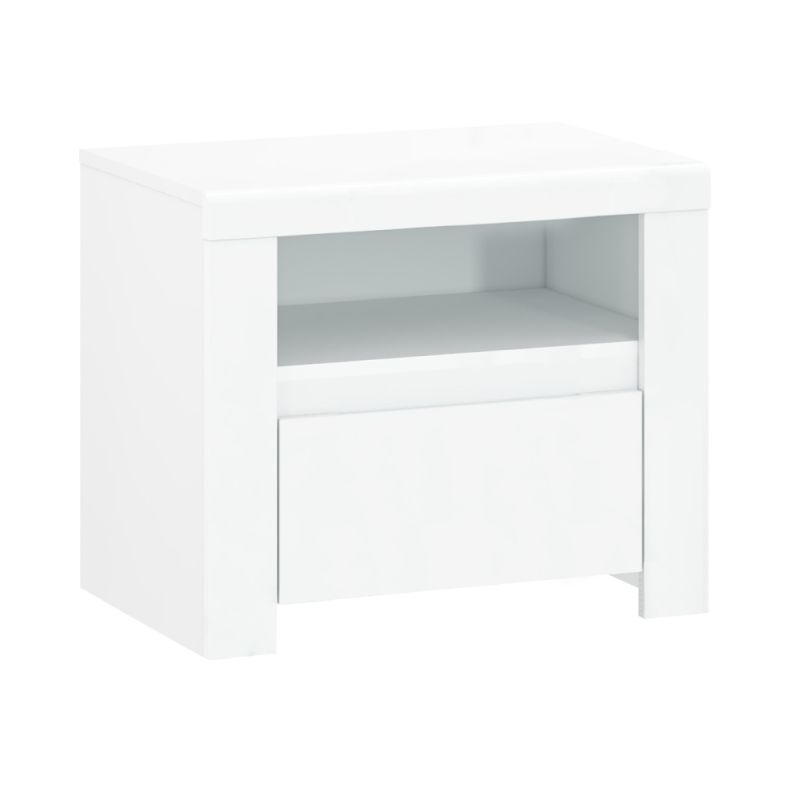 Elegantný nočný stolík vyrobený z laminovanej DTD s dvierkami z MDF a ABS hranami. Biely lesk dodáva stolíku moderný a štýlový vzhľad, ktorý skvelo zapadne do každej spálne či študentskej izby. Praktickosť zabezpečuje jedna zásuvka bez úchytiek, ktorú otvoríte jednoduchým potiahnutím, a otvorená polica v hornej časti