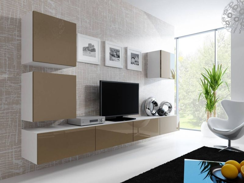 Obývacia stena zo závesných skriniek, biely mat-latte lesk