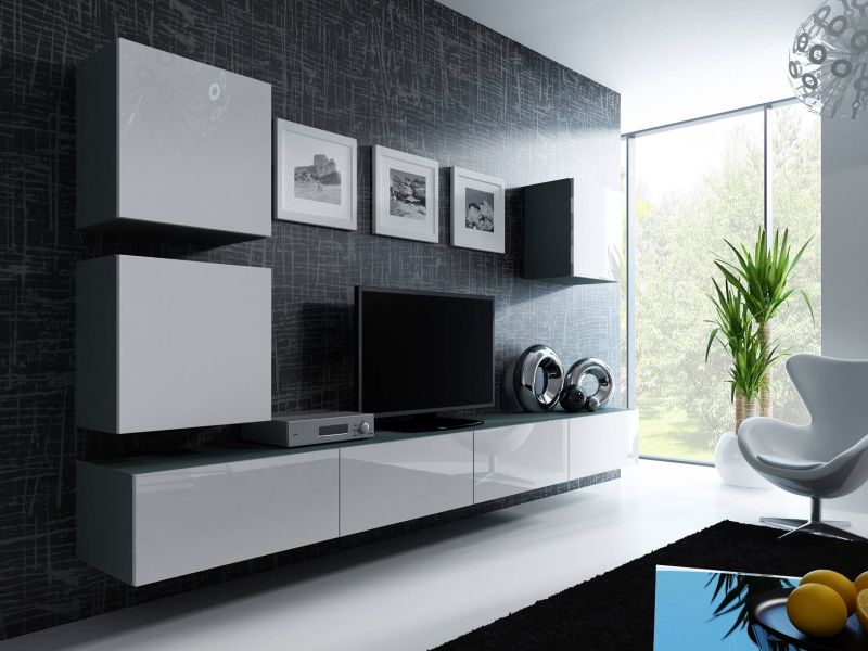 Obývacia stena zo závesných skriniek, sivý mat-biely lesk