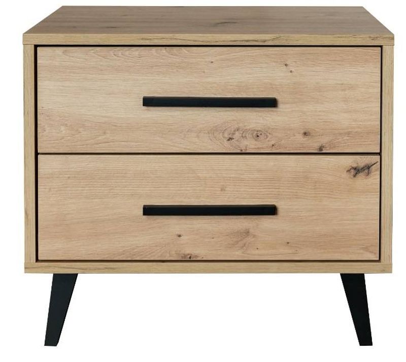 Praktický nočný stolík v dekore dub artisan zaujme jednoduchým a zároveň moderným vzhľadom. Dve zásuvky s čiernymi úchytkami ponúkajú dostatok úložného priestoru. Vysoké nohy uľahčujú upratovanie a zároveň dodávajú stolíku odľahčený vzhľad