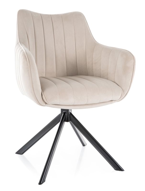 Otočná jedálenská stolička kombinujúca čiernu a svetlobéžovú farbu, je navrhnutá podľa moderných štandardov, no dokonale zapadne aj do interiérov v glamour štýle. Stolička sa vyznačuje sedadlom, ktoré sa otáča o 180°, poskytujúc tak extra pohodlie a flexibilitu. Sedadlo a operadlo s lakťovými opierkami je čalúnené mäkkou a príjemnou látkou. Podnož stoličky je vyrobená z kovu, pričom jedna centrálna noha sa rozširuje do štyroch rovných nôh, zaisťujúc tak stabilnú oporu.
