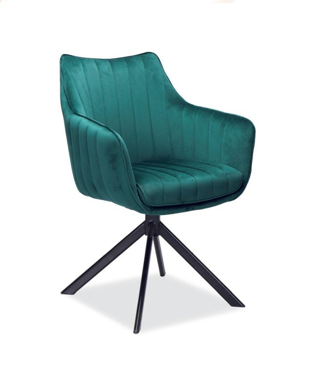 Otočná jedálenská stolička, ktorá spája čiernu a zelenú farbu. Stolička je navrhnutá podľa moderných štandardov, ale svojim štýlom sa hodí aj do interiérov v glamour štýle. Unikátnou vlastnosťou tejto stoličky je sedadlo, ktoré sa otáča o 180°, poskytujúc tak extra pohodlie a flexibilitu. Sedadlo a operadlo so zelenými lakťovými opierkami sú čalúnené mäkkou a príjemnou látkou. Podnož stoličky je vyrobená z kovu, kde jedna centrálna noha vyčnieva zo sedadla a rozširuje sa na štyri rovné nohy, zabezpečujúc stabilitu a odolnosť.