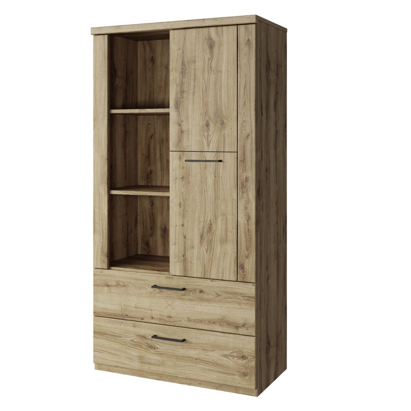 Moderný otvorený regál v elegantnom prevedení dub navarra, vyrobený z laminovanej drevotriesky s MDF korpusom. Kombinácia otvorených políc, jednodverovej skrinky a dvoch šuplíkov poskytuje bohatý úložný priestor aj možnosť vystavenia dekorácií, kníh či pohárov. Praktické čierne plastové úchytky uľahčujú manipuláciu