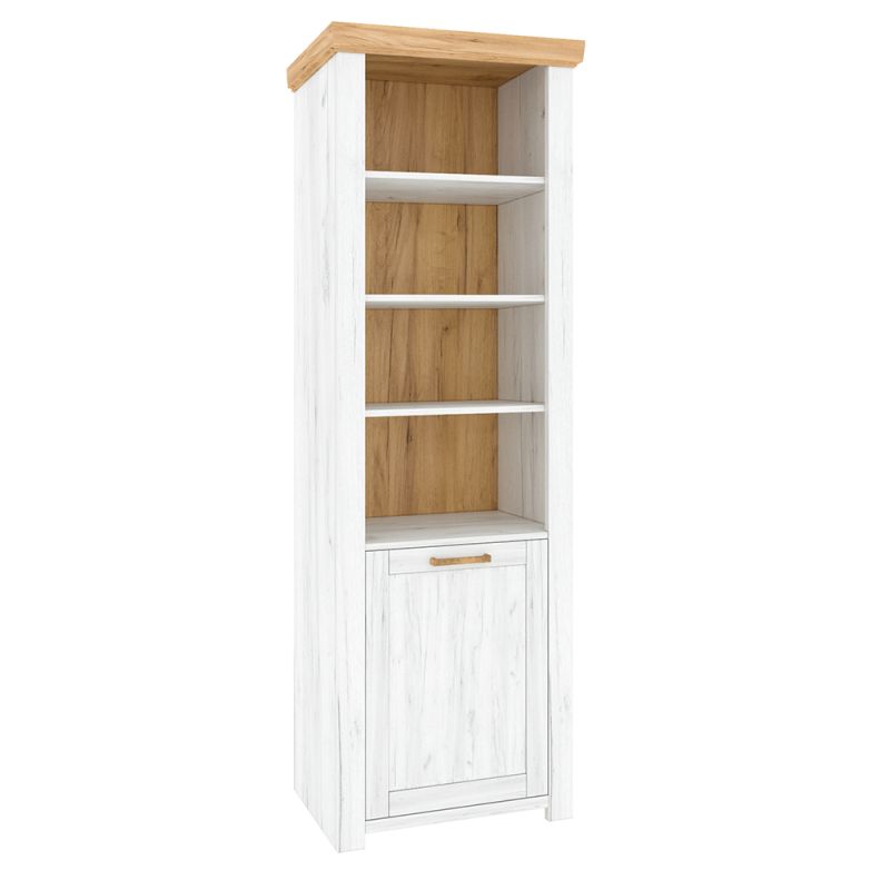 Vrchná doska je hrubšia a zvýrazňuje robustný vzhľad nábytku, zatiaľ čo dvierka v bielom odtieni kontrastujú s tmavším dekorom dub craft zlatý, čím dodávajú regálu moderný a elegantný vzhľad