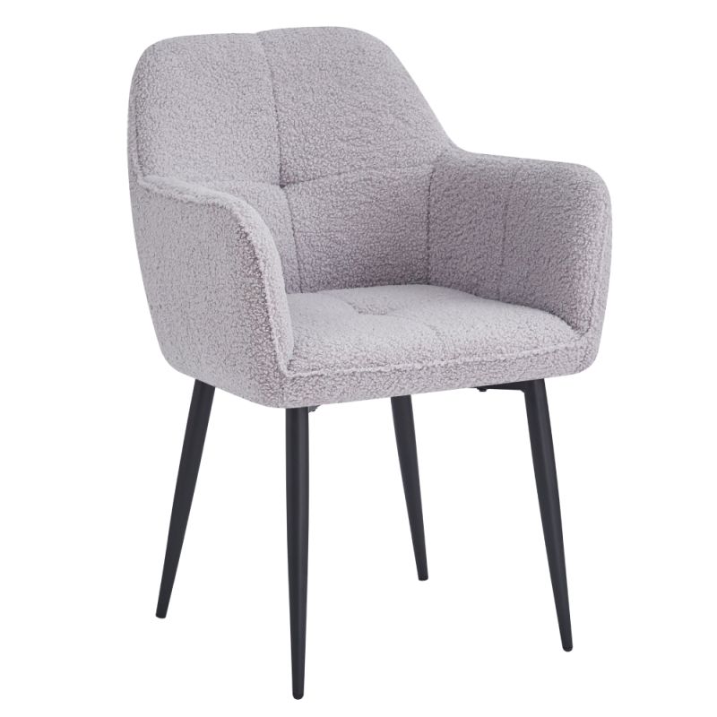 Toto elegantné sivé kreslo čalúnené látkou bouclé ponúka pohodlné a štýlové sedenie. S čiernymi kovovými nohami a tvarovaným operadlom s opierkami na ruky je ideálnym doplnkom pre vašu jedáleň, obývačku alebo pracovný kút