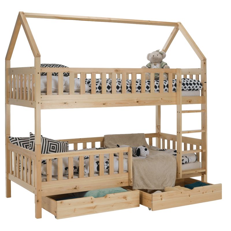 Poschodová posteľ v tvare domčeka z masívneho borovicového dreva v prírodnom farebnom prevedení je praktickým a bezpečným riešením do detských izieb. Vďaka jednoduchému dizajnu a čistým líniám sa ľahko prispôsobí rôznym štýlom interiéru. Horné aj dolné lôžko majú bezpečnostné bariéry, ktoré zaručujú ochranu počas spánku. Rebrík je možné umiestniť na pravú alebo ľavú stranu podľa potreby. Posteľ má dve veľké zásuvky na kolieskach a možnosť rozloženia na dve samostatné lôžka. Dodávaná s rolovanými preglejkovými roštami, bez matracov