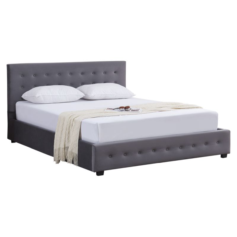 Manželská posteľ čalúnená elegantnou Velvet látkou v sivom odtieni, ktorá kombinuje luxusný vzhľad s praktickosťou. Mäkké čelo s penovým vypchávkou a jemným prešívaním zdobí prednú i zadnú časť postele