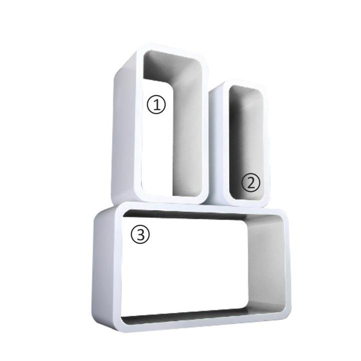 Sada troch praktických políc rôznych veľkostí v bielej farbe, vhodných do moderných interiérov. Vyrobené z kvalitného materiálu MDF