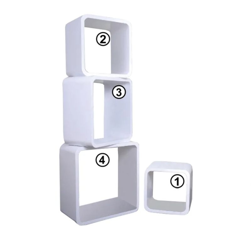 Sada štyroch praktických políc rôznych veľkostí v bielej farbe, ideálnych do moderných interiérov. Vyrobené z kvalitného materiálu MDF.
