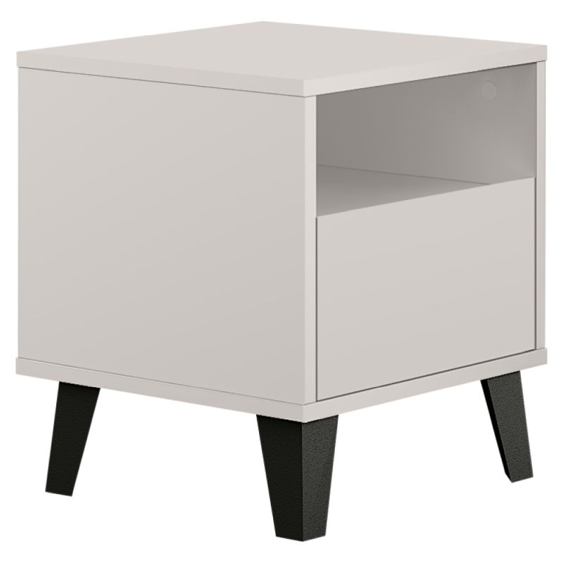 Nočný stolík v nadčasovom dizajne v jemnom farebnom prevedení kašmír je praktickým doplnkom do spálne, detskej či študentskej izby. Ponúka úložný priestor v podobe jedného šuplíka a otvorenej odkladacej plochy. Čierne nožičky podčiarkujú jeho moderný vzhľad
