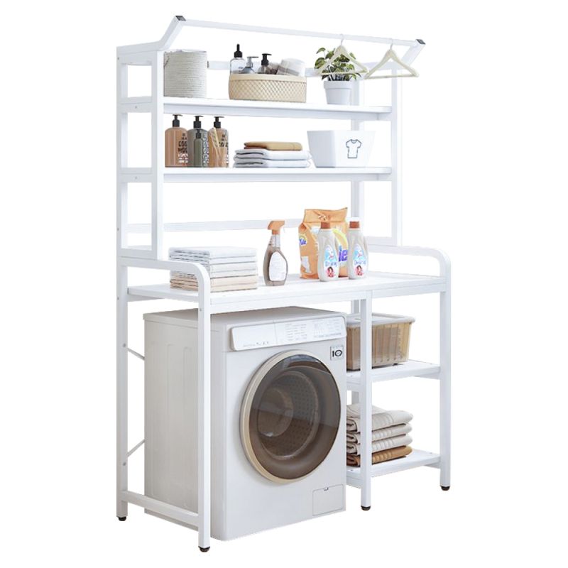 Praktický regál určený na umiestnenie nad práčku, ktorý efektívne maximalizuje úložný priestor v kúpeľni alebo práčovni. Disponuje otvorenými policami na boku a v hornej časti. Horná časť regálu umožňuje zavesenie vešiakov pre pohodlné sušenie prádla. Vyrobený je v bielom prevedení z kombinácie laminovanej MDF a kovu