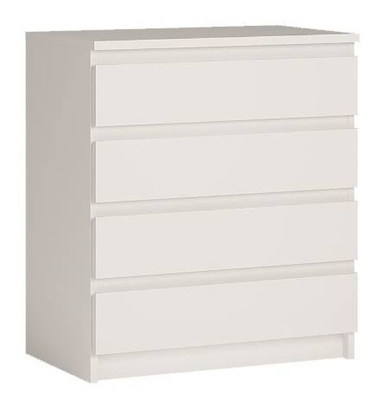 Priestranná komoda, ktorá je vyrobená z vysokokvalitného lamina v čistom bielom farebnom prevedení. Táto komoda s štyrmi zásuvkami je ideálnym riešením pre tých, ktorí hľadajú spojenie elegantného dizajnu s praktickým úložným priestorom.