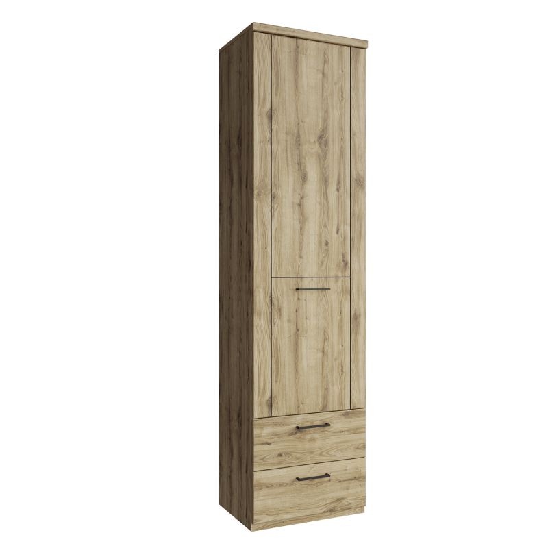 Elegantný regál v prevedení dub navarra, vyrobený z laminovanej drevotriesky s korpusom z MDF. Jednodverový model s praktickými čiernymi plastovými úchytkami ponúka bohatý úložný priestor – za dvierkami police a dva šuplíky pod nimi