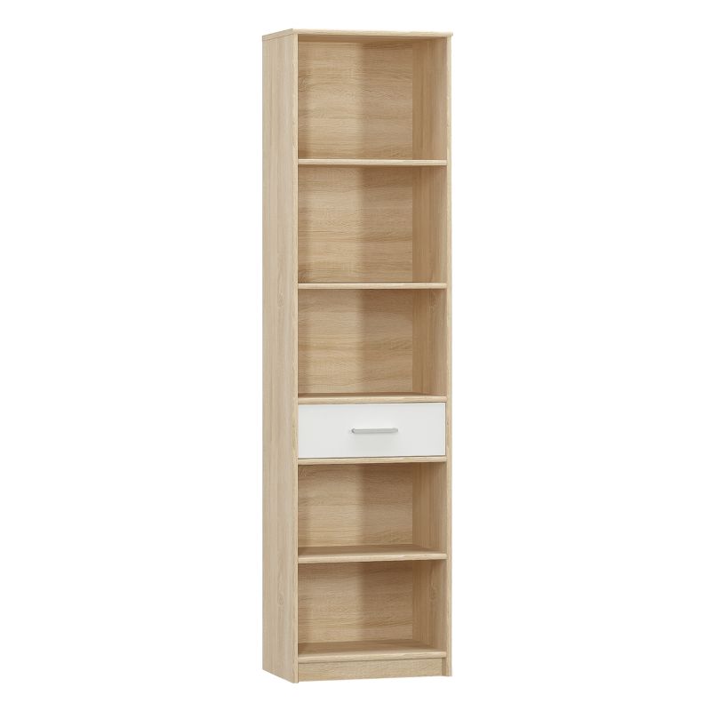 Regál z laminovanej DTD vo farebnom prevedení biela a dub sonoma. Poskytuje úložný priestor v podobe jedného šuplíka a piatich otvorených políc