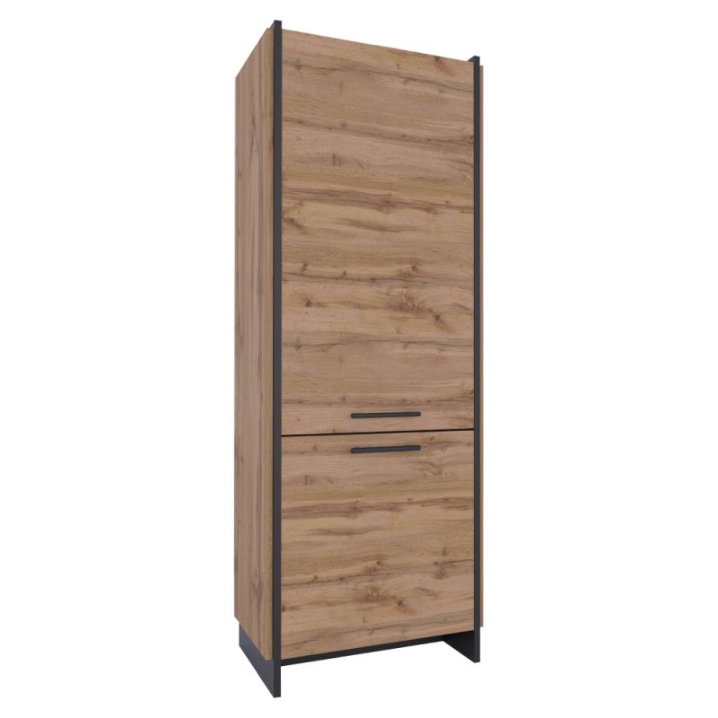 Regál v modernom spojení dekoru dub wotan a čiernej farby prináša štýl a praktickosť do každej miestnosti. Kovové čierne úchytky a ABS hrany zabezpečujú odolnosť a elegantný vzhľad. Tento dvojdverový regál poskytuje úložný priestor ukrytý za dvierkami, vhodný do detskej izby, spálne, obývačky či predsiene