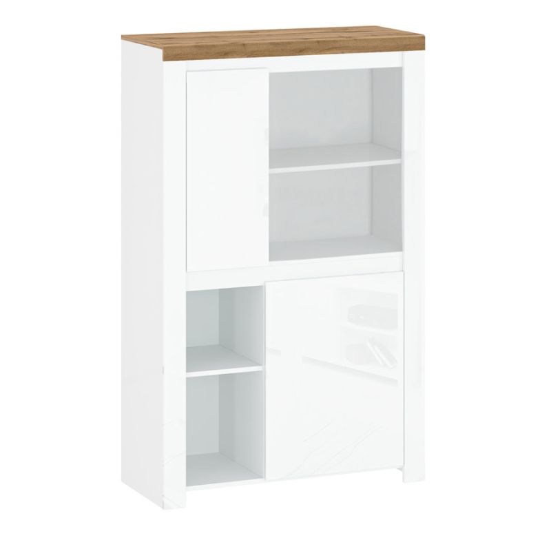 Regál je rozdelený na tri hlavné sekcie. V hornej časti sa nachádza otvorený úložný priestor s dvomi policami, ktoré sú ideálne na vystavenie kníh, kvetín či dekorácií. V spodnej časti sa nachádzajú dve skrinky s dvierkami, každá vybavená vnútornou policou, čím vzniká viacero odkladacích plôch pre drobnosti, ktoré chcete mať skryté a usporiadané