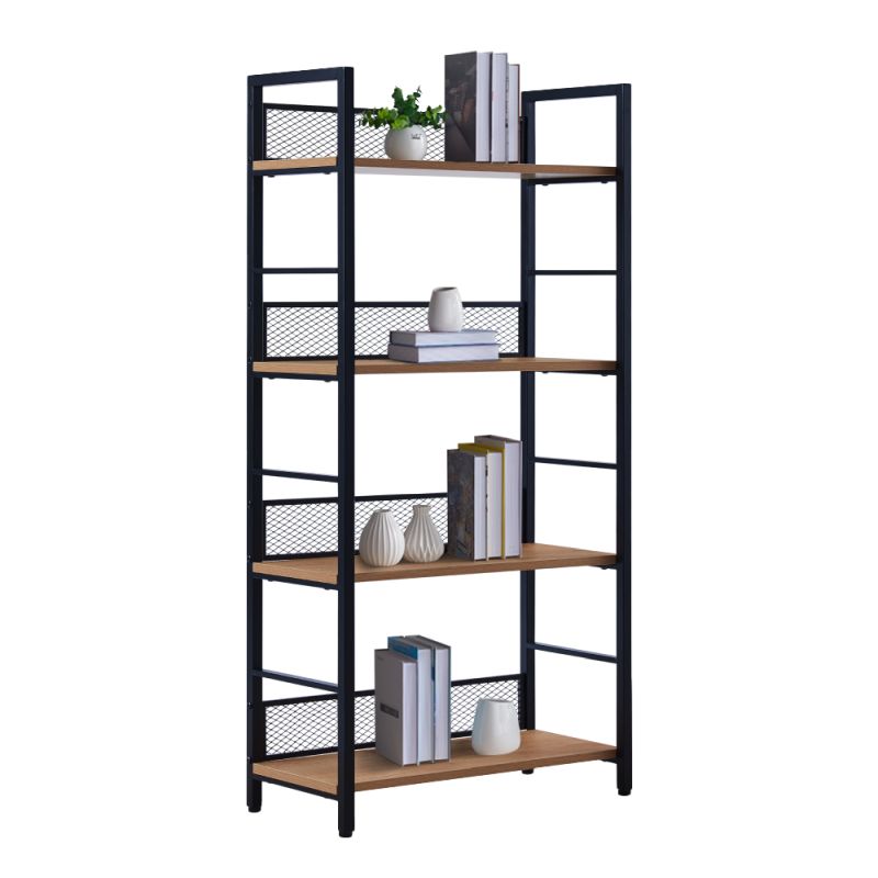 Regál ponúka dostatok úložného priestoru na štyroch policiach. Stabilitu zaisťuje kovová konštrukcia v čiernej farbe, doplnená policami v odtieni dub. Zadná časť je ohraničená čiernou kovovou sieťkou, ktorá štýlovo dotvára dizajn