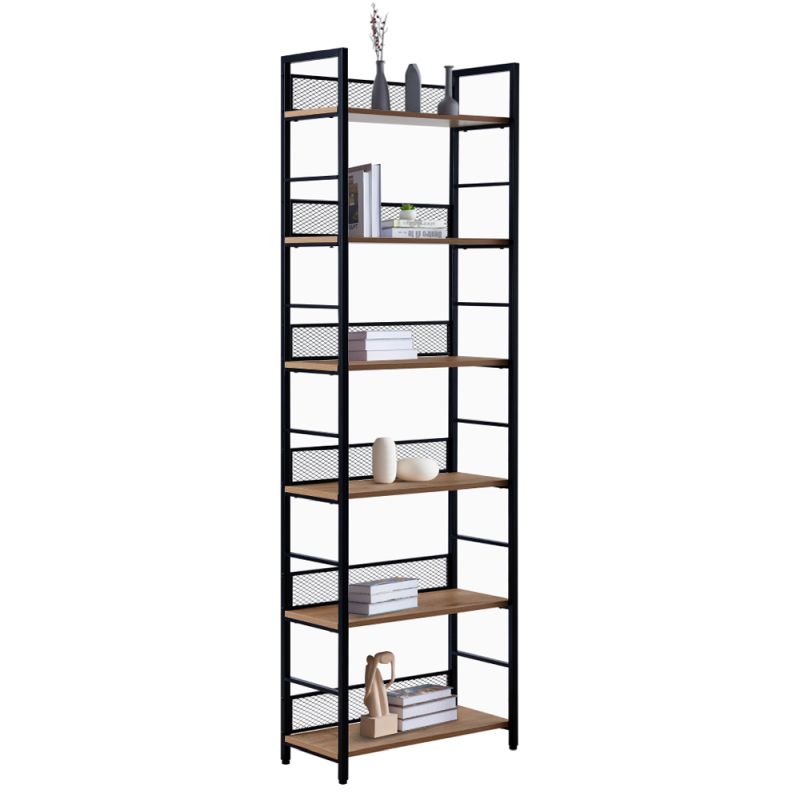 Regál s pevnou kovovou konštrukciou v čiernej farbe a policami v odtieni dub poskytuje dostatok úložného priestoru na šiestich policiach. Zadná časť je zakončená čiernou kovovou sieťkou, ktorá elegantne dopĺňa moderný a praktický dizajn. Police sú ideálne na vystavenie kníh, dekorácií, kvetov či suvenírov