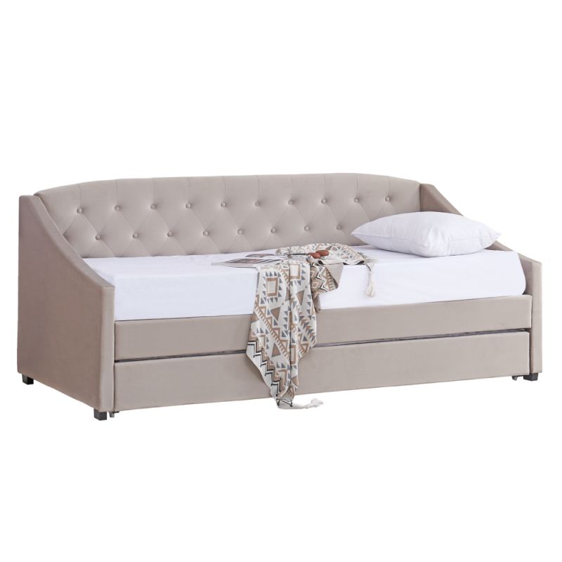 Elegantná rozkladacia posteľ s prístelkou čalúnená zamatovou látkou Velvet v odtieni hnedosivej Taupe. Praktické a štýlové riešenie s dekoratívnym prešívaním na čele a ľahko vysúvateľnou prístelkou na kolieskach